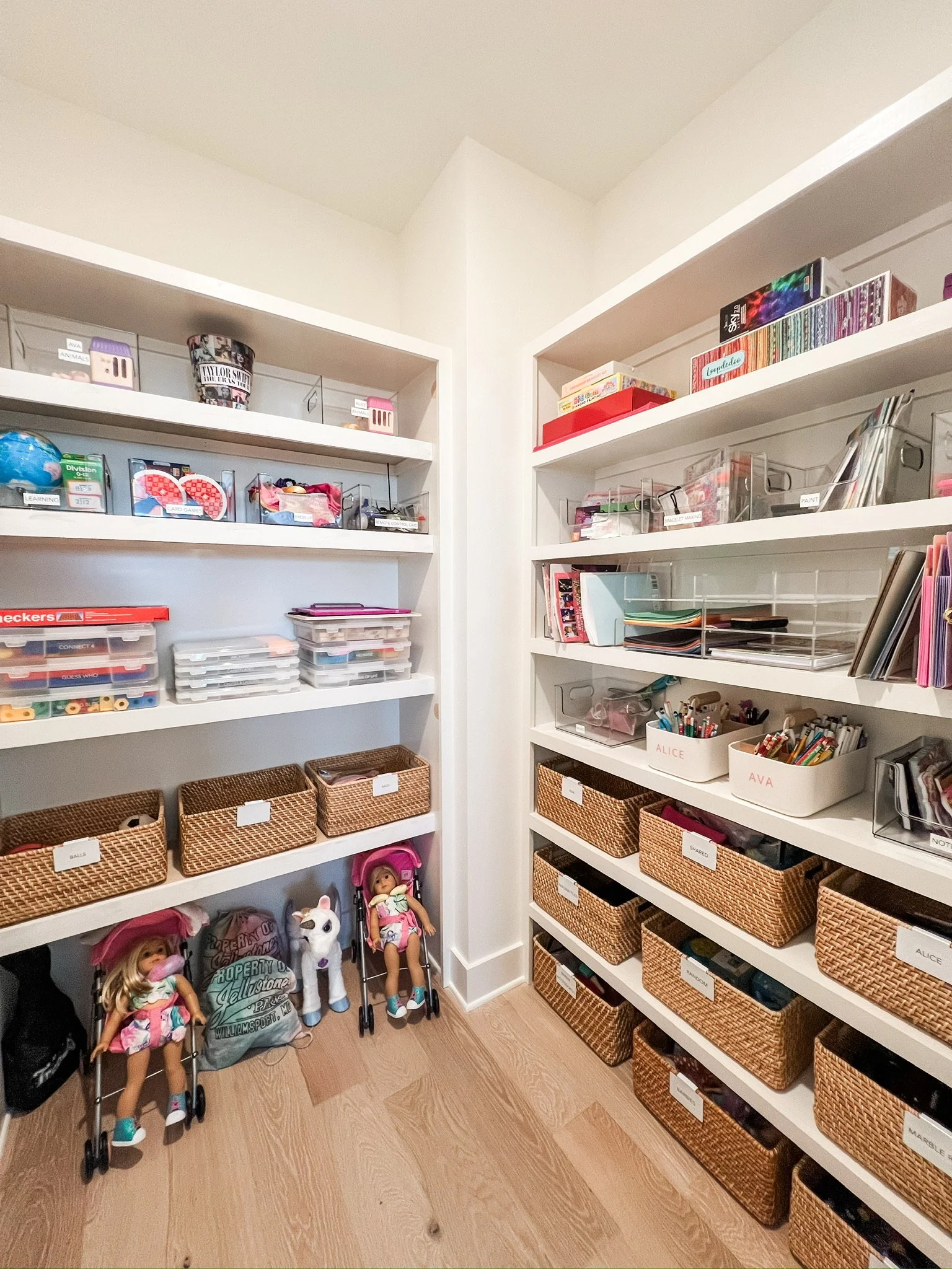 Clear bins are perfect for visual learners, they can see exactly what’s inside. But if you prefer a cleaner, more aesthetic look, go with baskets that hide the clutter while keeping everything accessible. The best systems blend practicality with your home’s style.